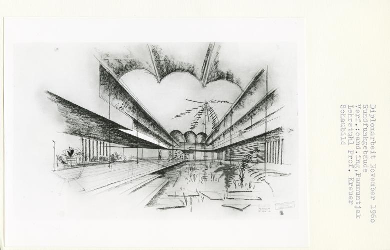 Diploma project for a ‘Broadcasting Building’ by Mustafa Pamuntjak at TU Berlin in 1960. (Source: Technische Universität Berlin, Architekturmuseum, Inv. Nr. 68918)