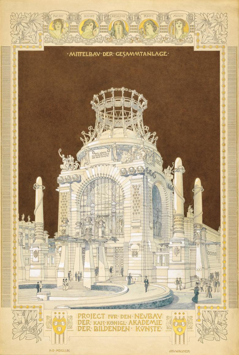 He was the only Viennese architect of his generation to bridge the gap between historicism and “modern architecture,” to which he had already devoted a highly acclaimed paper in 1896. Otto Wagner (1841–1918) was not only an extraordinary architect and architectural theorist, but also a talented draftsman and an influential teacher (at the Vienna Academy of Fine Arts) for the next generation of architects. His office employed Josef Hoffmann, Joseph Maria Olbrich, and Josef (Jože) Plečnik, among others who—before making their mark in Vienna, Darmstadt, Prague, and Ljubljana—worked in Wagner's studio, developing his designs and visualizing them in exquisite drawings.