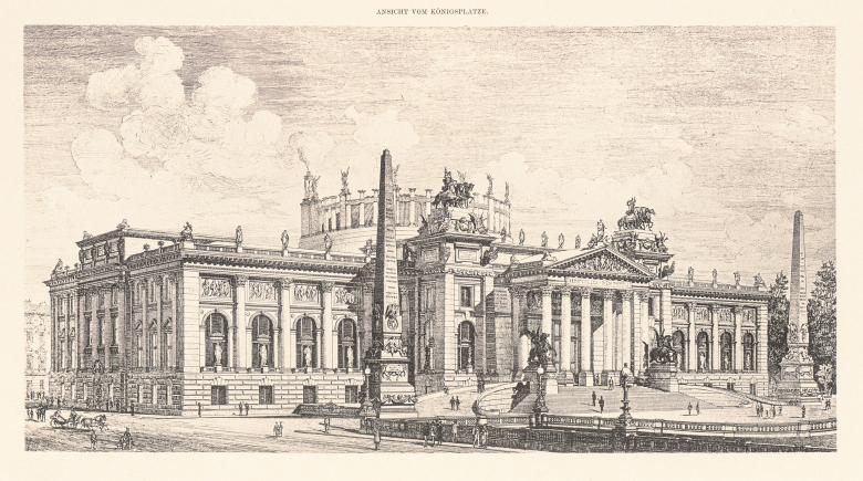 Another turning point—this time in Viennese art history—was marked in 1897 by the founding of the Vienna Secession, to which the fourth chapter, “Secession!,” is devoted. The Secession, which was influenced from the outset by Wagner's colleagues Hoffmann and Olbrich—the creator of the artists' association's “built manifesto” (1897/98)—was used by the actual “founding father” to exhibit ambitious projects, often without a specific planning commission. The colored sheets with allegorical Art Nouveau frames—for example, of a parish church in Währing (illustrators: Karl Ederer, Alois Ludwig, 1898) and for a new building for the Academy of Fine Arts as a veritable art quarter with a Hall of Honour in front (Karl Ederer, Emil Hoppe, 1898), as well as the studies for the expansion of the Wiener Hofburg (Franz Matouschek, 1898) and for a modern art gallery (1899), also in color and exhibited here for the first time—are sure to make the heart of any lover of artistically ambitious architectural drawings beat faster.