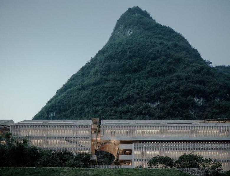 The Alila Hotel by Beijing's Vector Architects (Gong Dong) is also part of the exhibition. Completed in 2018, the hotel is located near the city of Guilin, a popular tourist destination for its dramatic karst mountains. The architects repurposed an abandoned sugar factory from the1960s and expanded it with a suite building. The exterior design and the use of uniform materials merge the new and existing buildings.