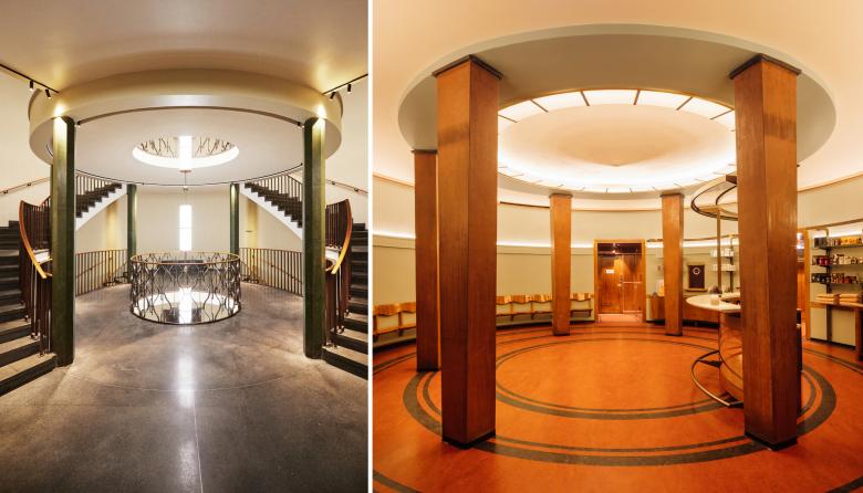 Bjercke and Eliassen were known for favoring functionalism over the National Romantic style and their design shows that ambivalence. They had a sense of high-quality materials: polished Gjellebekk marble for the stairs, fine terrazzo floors, walls covered in matte plaster, details in wood and cast iron. The painter Ulrik Hendriksen advised the architects in the choice of colors. While the dark red brick facade with flat roof resembled Italian Neoclassicism, the details inside clearly were Art Deco in their geometries, shapes, and patterns. The climax of the building was the great customer hall, where people paid their energy bills. The Expedition Hall with Per Krohg’s great mural was a stylish sign of modern times to come.