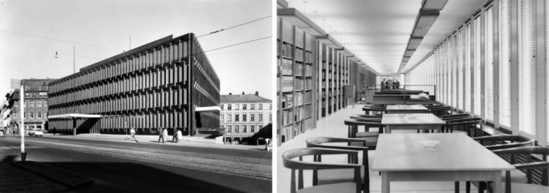 Former US Embassy in Oslo: exterior ca. 1970 (Photo: Karl Teigen/Oslo City Archive/CC BY-SA 3.0), library interior in 1959 (Photographer unknown/Oslo Museum/CC BY-SA 3.0)