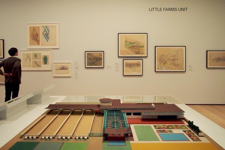 Of the dozen mini-exhibitions that make up Frank Lloyd Wright at 150, half of them focus on specific projects while the other half consists of subjects that are broader, such as "ornament," "ecologies and landscapes," and "urbanism." From the former, the projects include, in order of the exhibition: the Imperial Hotel in Tokyo, the Little Farms Unit, the Nakoma Country Club, the Rosenwald School, the "Mile-High" skyscraper, and the American-Built System Houses. These projects, most of them unbuilt, are far from obvious choices. This reviewer was unaware of the Little Farms Unit, the Nakoma Country Club, and the Rosenwald School, three projects that make up the exhibition's D-E-F sections and, inadvertantly according to Bergdoll, find overlap through agriculture, indigenous culture, and African American society. Spanning a rougly ten-year period from the mid-1920s to mid-1930s, these projects offered Juliet Kinchin, Elizabeth Hawley, and Mabel Wilson, respectively, the chance to delve into the designs as well as Wright's views on politics and race.