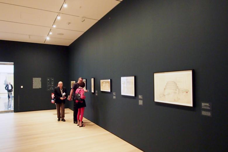 With such an ambitious and multi-faceted exhibition, a couple pieces are important for visitors who want to understand what was discovered through the unpacking; reading the wall text and looking at the drawings are not sufficient. First are the short films that accompany each of the dozen sections. These show the relevant scholar or museum conservator actually interacting with the artifacts in the archive. These revealing glances are especially helpful for non-architects or those without an already deep knowledge of Wright. People who know Wright's work fairly well – or those who want more than what is gained from watching a series of short films and trying to take in more than 400 drawings and other artifacts – should head to the gift shop for the second piece, the catalog that accompanies the exhibition. In it, the contributor's short essays hone in on those objects and the discoveries made through interacting with the archive. Often, exhibition catalogs pad images of the art or architecture on display with an essay or two. But here the essays are the meat of the publication and a necessary extension of the exhibition's revealing insights into some of Wright's overlooked designs.
