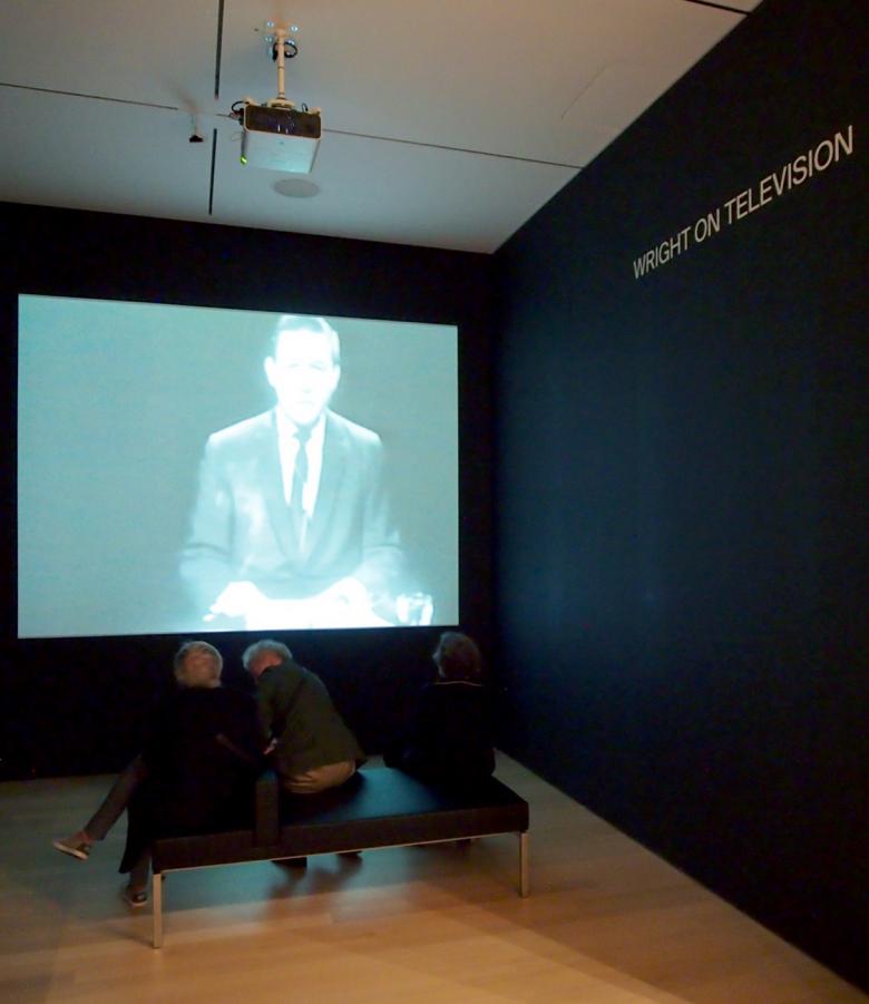 Housed in a renovated gallery within MoMA's original 1939 building (part of the first phase of DS+R's ongoing renovation), the exhibition appears just like any other: a series of rooms demarcated by simple, painted walls with mounted drawings and wall text, and the occasional vitrine and model. A map to the side of the entrance doors lays out the dozen rooms or sections that correspond to the scholarly explorations. More suggested than forced or required, the route through the exhibition moves in alphabetical order, from A to L, culminating in a thirteenth room that is devoted to Wright's appearances on television in the 1950s. This last part is visible in the distance immediately upon entering the exhibition and functions like a draw through the roughly chronological sections before it.