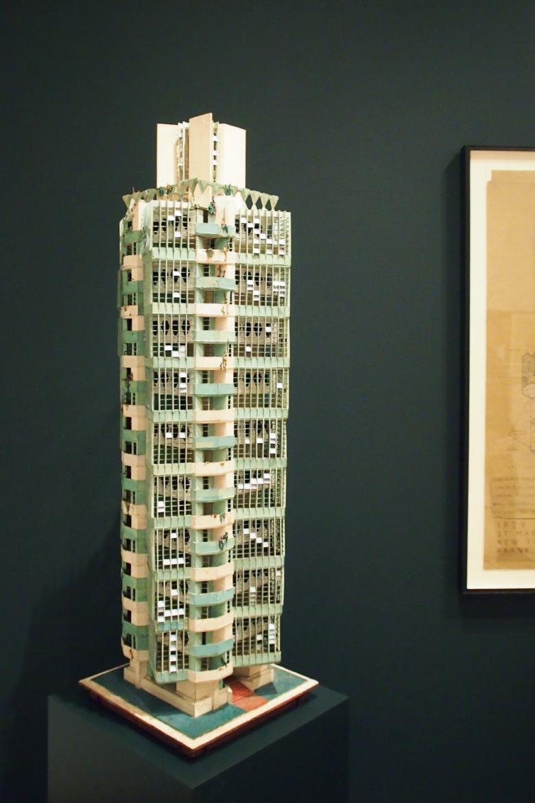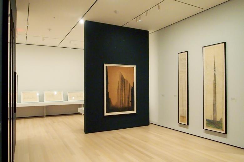 The lettered section given the most real estate is Bergdoll's own contribution, "Reading 'Mile-High'," about Wright's unsolicited and unprecedented 1956 design for a mile-high skyscraper. Wright is known for low, horizontal buildings rather than skyscrapers. In the latter camp can be counted merely a handful of designs, only a couple built: the H.C. Price Company Tower in Oklahoma (1956) and the Research Tower at Johnson Wax in Wisconsin (1950). These buildings, as well as the unbuilt St. Mark's Tower that is part of the exhibition, use the so-called "taproot" structural system, where floors are cantilevered from a central mast anchored deep in the ground. For the Mile-High Illinois, Wright took the system to its extreme, pushing it twice as high as today's world's tallest, the Burj Khalifa in Dubai. What was ludicrous in its day is not so far-fetched six decades years later, as the kilometer-high, Mile-High-looking Jeddah Tower moves toward a 2020 completion.