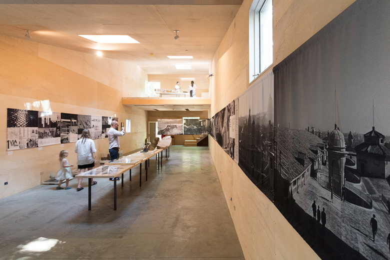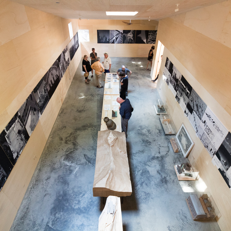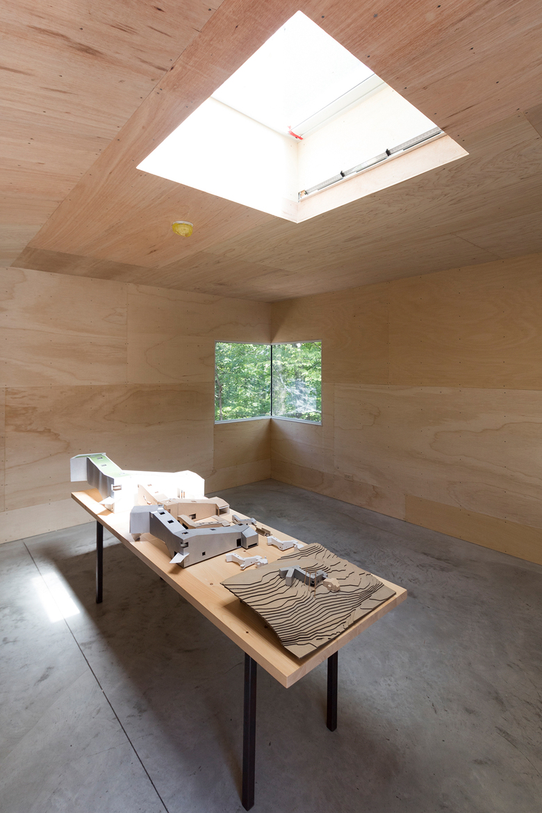 Rome and the Teacher occupies a single, long room in ArtArc, a new building on the T2 Reserve, one of two adjacent properties in Rhinebeck that Steven Holl has been adding buildings and artworks to for years and opens up to the public in the benign summer months. Collectively known as 'T' Space, the wooded properties feature a gallery, a studio and cabin for fellows, art trails, the Ex of IN House, and now ArtArc, which wasn't quite completed in time for the exhibition opening. Having just broken ground in October 2018, Holl asserted the building was 75% done, due in part to delays in the aluminum panels that will soon wrap the whole building.