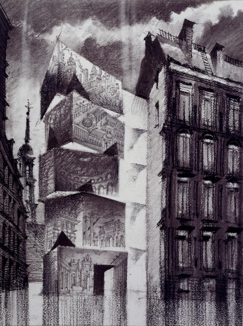 The last of the book's four parts focuses on the Museum for Architectural Drawing, which can be seen as the convergence of Tchoban's various roles: architect, collector, artist, curator, and exhibition designer. Ten years before the museum opened its doors in 2013, Tchoban and Feireiss collaborated on Hand-Drawn Worlds, a book of drawings by contemporary architects and, for Tchoban, "further affirmation of people's enthusiasm for architectural drawing." Tchoban's own enthusiasm for the media extends literally to the facade of the museum: its structural concrete facades feature reliefs based on drawings by Gonzaga and Angelo Toselli, another Italian scenographer. Tchoban conceptualized the skewed, stacked cubes as a drawing cabinet; in turn, the surfaces express what is contained inside the diminutive museum. Although it is currently closed until further notice as part of Germany's measures to combat COVID-19, the exhibitions inside the Museum for Architectural Drawing are a diverse and rewarding lot, ranging from Piranesi and British Neoclassicism to Alexander Brodsky, Thom Mayne, James Wines, Lebbeus Woods, and other contemporary architects with instantly recognizable output. As Deyan Sujdic describes him in a contribution to Lines and Volumes, Tchoban is "a cultural entrepreneur determined to give architectural drawings the attention that they deserve." Turns out Tchoban is worthy of our attention too.