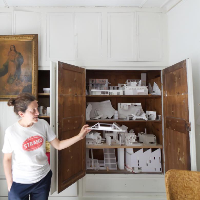 At the far end of the studio — the south end overlooking the Gothic Quarter — were more workstations, but they sat empty, the computers and screens off and moved to the side. Most architecture studios, it seems, have shifted entirely from hand drawing to computer drafting and modeling, with their spaces and furnishings reflecting that technological evolution: parallel bars and drafting desks have given way to desks topped by computer screens and mousepads. Flores and Prats still draw by hand, but all of the digital drawing is done by their employees. They described the process in their studio as a constant back-and-forth between hand drawings/hand models and digital drawings/models. In the end the projects need to be documented primarily in the computer (they said 10% are hand drawings) so they can be shared with consultants and submitted for permits. But one would not know that when moving through their studio: drawings and models — and even painted stencil letters — done by hand cover nearly every surface. As such, a visit to Flores & Prats is a literal immersion into the couple's work.