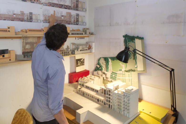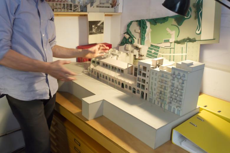 Two other in-progress projects could be seen and were discussed when moving through the studio: Building a Community in Lund, Sweden; and Théâtre des Variétés in Brussels. Both projects see the studio moving beyond the confines of Catalonia, where most their projects have been located. The first project was the winning entry in a restricted competition and involved designing the first collective housing buildings — the Tower House and the Corner House — for a new urban development in Råängen, on the outskirts of Lund. The second project was another competition win, this time as part of Open Call process in Flanders: the renovation of the Variétés Théâtre, a listed building in the center of Brussels, and its conversion into an "International Laboratory for Artistic Creation." Being carried out with Ouest Architecture, Flores & Prats describe the project on their website as having "continuity with that of the Sala Beckett" by "dealing with the recovery and re-use of an abandoned building in a state of ruin" and turning it into "a center of cultural activities for its city."