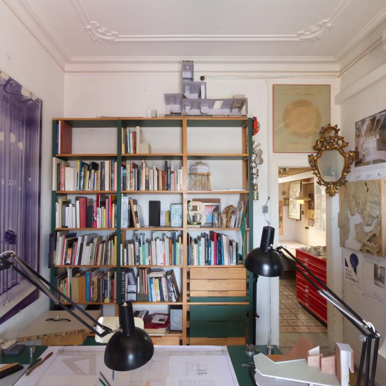 It was a Saturday afternoon and the last weekend of Barcelona Architecture Week, when BARQ, Model, and other events were taking place across the city, but the ten-person studio was nearly full, working toward an upcoming deadline. Most of the employees were building models at the desks in the front room, a large north-facing space with shelves covered in books as well as models, drawings, and other documents. The ornate coved ceiling hinted that this room used to be two rooms, a wall dividing it in half when it was an apartment rather than an atelier. The mismatched floor tile reinforced this former spatial division. The whole studio was full of such remnants, links to the space's past; the pair clearly treasures old materials, as true here as in projects like Sala Beckett. Minus the missing wall up front, the old apartment was more or less intact, acting as a frame for Flores and Prats to accommodate their drawing tables, workstations, shelves, models, mementos, and other pieces of their work-lives.