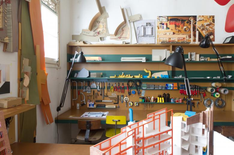 Like the whole studio, the tools in the model shop are carefully displayed, while parts of models — including ducts in yellow and blue — are saved for potential future use. (Photo: John Hill/World-Architects)