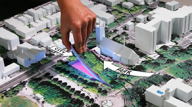 Many of the projects that Mr. Shigematsu and I talked about are not ready for public consumption, but one that is well on its way to completion is his 2010 competition-winning design for the Musée National des Beaux-Arts du Québec (MNBAQ) in Québec City. The form echoes the daring cantilever of Milstein Hall, but here it is a three-story building whose gradual stepping creates an enclosed public space. The inverse of this grand space facing the city is an extension of the park over the roofs, as the diagram above illustrates.