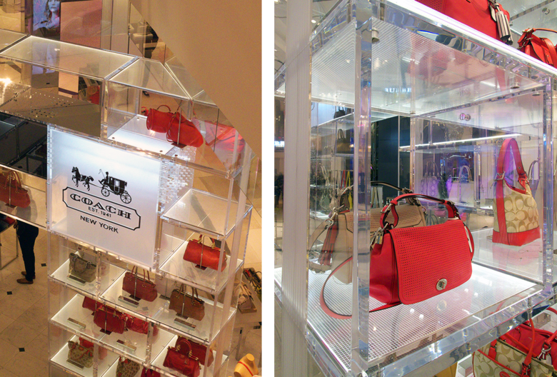 The second project is a kiosk for leather goods company Coach in the Macy's store at Herald Square. The department store is in the midst of a $500 million renovation of its full-block store, and one of its first tasks was to change its main entrance at 34th and Broadway, where a number of luxury designers (Burberry, Longchamp, Gucci) inserted mutli-floor boutiques into the perimeter. Coach is one of the brands relegated to the selling floor, but this did not discourage Mr. Shigematsu from pushing the envelope, if you will, to give them more exposure. Faced with Macy's own version of New York City's Zoning Code, OMA shaped the plan of the custom acrylic shelving (embedded with LED lighting) to build above the allowable height; Macy's allowed the two walls of storage in a compact V-formation to extend all the way to the ceiling. This reveals how OMA is never content to work within restrictions, but it is also just the beginning of a longterm relationship with Coach.