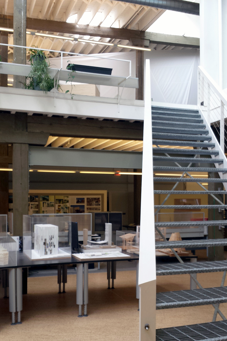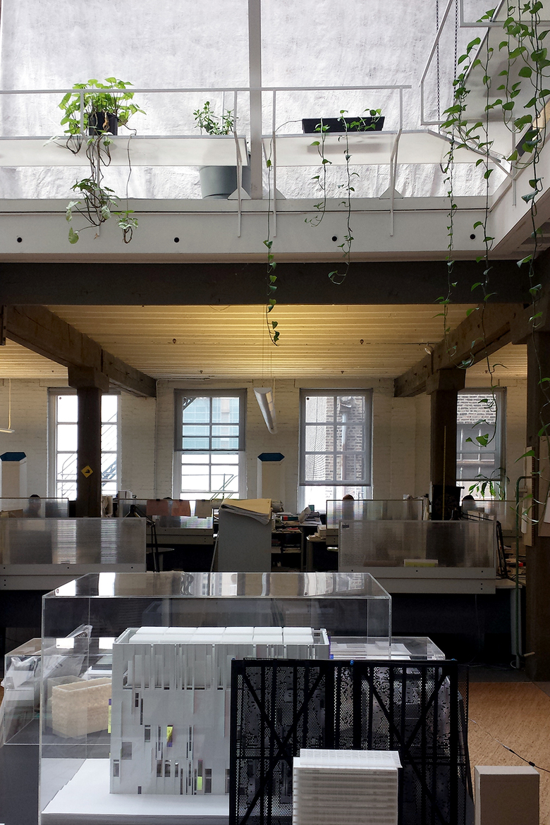 The current office of r_barc/former office of Harry Weese is located on the top two floors of a building in the city’s River North neighborhood. It is a light-filled, multi story space that is also quite idiosyncratic, at least based on one story Carol told me. Weese was a heavy drinker, often starting over lunch each day. This would often lead to him sleeping it off in the office, which he would do in a loft above the area with the kitchen and the bathrooms. Right above the loft was – and still is – a tiny skylight that would help Weese wake up in the morning. But the most dramatic skylights are located over the double-height space and diagonal stair that links the two floors. This is the heart of the office, where light bathes the studio, plants grow over the guardrail, and models of r_barc's numerous buildings are on display.