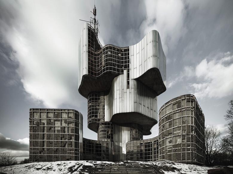 One of the most remarkable buildings in Toward a Concrete Utopia is the National and University Library of Kosovo (1982), encountered in the first section through an impressive model and some drawings and photographs. Designed by Andrija Mutnjaković as a clutser of small cubes illuminated by nearly 100 domes and shaded by metallic screens, the library was used by the Yugoslav army in the 1990s and emptied of much of its contents, though this century it has returned to serve its original purpose. As shown above, it is one of the buildings given the Valentin Jeck treatment. He captures the library below a swirl of gray clouds that lighten above the building's mountainous profile. Paradoxically, shadows cast across the muted grass in the foreground, combined with the illumination of the building's filigree facade, hint at the presence of the sun to the left of the frame – a parting in the gray clouds.