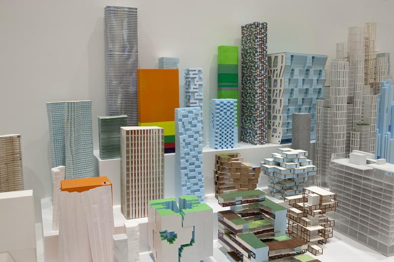 Display of study models for tall buildings in Building: Inside Studio Gang Architects at the Art Institute of Chicago in 2012/13 (Photo courtesy of the Art Institute)