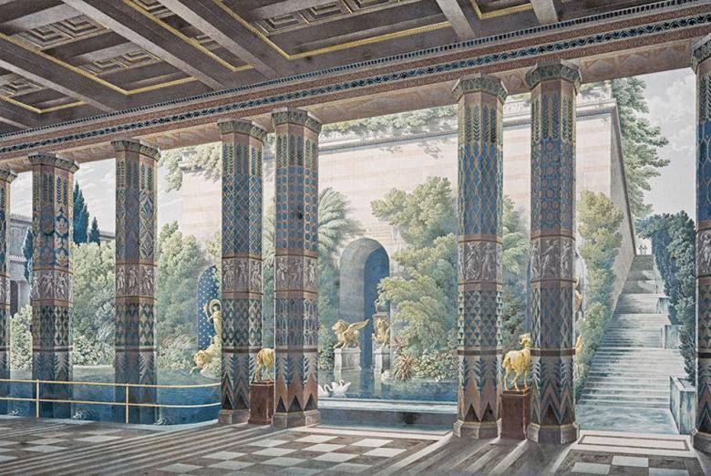 “Perspective View of the Grand Pool to the North of the Imperial Garden Court, Looking Towards the Podium Housing the Crimean Museum. From Palaces, a set of prints of the Palace on the Akropolis, Athens, and the Orianda Palace in the Crimea,” 1846 (Drawing by Heinrich Mützel, after Karl Friedrich Schinkel. Source: National Galleries Scotland/Creative Commons CC by NC)