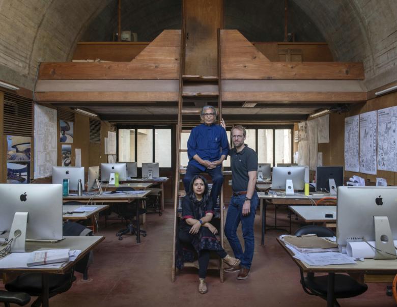 Balkrishna Doshi with Khushnu Panthaki Hoof and Sönke Hoof in their studio in Ahmedabad, 2018 (Photo © Vinay Panjwani)