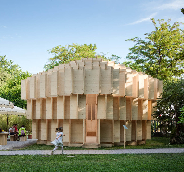Longtime visitors to the Venice Biennale have made the walk along the tree-lined Viale Giuseppe Garibaldi numerous times en route from the Giardini to the Arsenale and vice-versa, passing the Serra Dei Giardini. The cafe is still open, but this year the 1894 greenhouse is home to the collateral event The Forests of Venice, an installation initiated by Kjellander + Sjöberg Architects and curated by Jan Åman. Venice is built upon millions of trees driven into the lagoon, so it's a fitting venue for an exhibition arguing that wood is the best material for addressing climate change and other 21st-century social and environmental problems. Seven research proposals are located in the greenhouse, while a striking structure in wood by Kjellander + Sjöberg sits in front, drawing people into the exhibition as they walk about the Biennale.