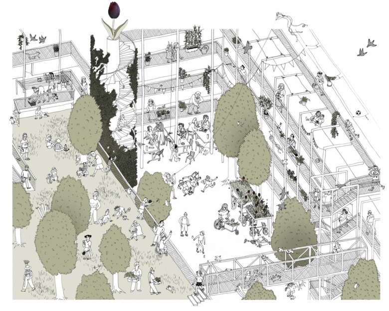 Nadja: Public uses include a neighborhood store, a pub, a mobility station and coworking spaces. Workspaces and apartments for people with disabilities ensure inclusion and diversity. Arcades provide access to the apartments and communal areas, and we have designed them so they can be used as meeting spaces. There will be different types of apartments ranging from studios to cluster apartments. Rooms that can be rented as needed are also envisaged. In addition, we have provided many options for the residents to extend and adapt the apartments themselves.