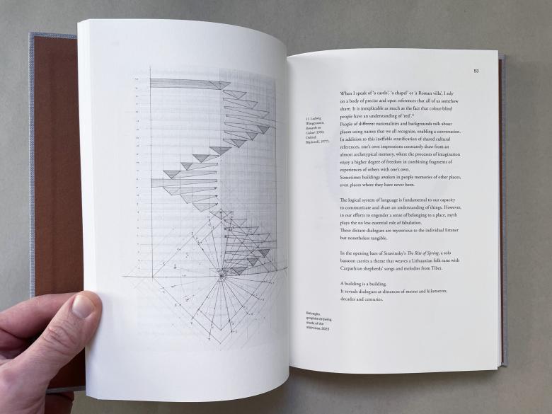 In form and presentation, Building Correctly more closely resembles Atmospheres, the transcription of a lecture Zumthor gave at the Festival of Literature and Music in Wendhausen, Germany, on June 1, 2003. Yet, while the editors of that book kept edits to the lecture at a minimum, “to preserve the spontaneity and immediacy of Peter Zumthor's words,” Torzo's book uses the lecture as a starting point, greatly revising and expanding it. I remember Torzo speaking slowly and carefully, such that a recitation of the words in this 192-page book would have gone well over her allotted fifteen minutes—this even granting that the lecture takes up half the book (it is followed by roughly 90 pages of “Documents” on nearly 20 projects in Torzo's studio). Outside of “Ladies and gentlemen, it is a beautiful day to honour the practice of architecture,” on page 11, and “Thank you” 74 pages later, Building Correctly is more like a diary with mediative thoughts and pithy statements rather than a lecture. Befitting Torzo's need for “time and the necessary quietness to focus on the work,” the time between the lecture and its realization in print, in June 2025, was just over three years.