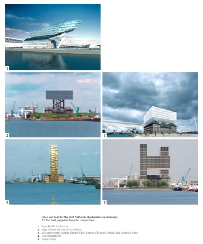 Simply put, Celebrating Public Architecture is a book of pictures and More Than a Competition is a book of words. Given the visual nature of architects, those both in and beyond Flanders should be more drawn to Celebrating, with its brief but beautiful presentations of seventy Open Call projects. The selection of built works is organized in four roughly equal sections that are separated by a trio of essays that illuminates the Open Call process. Editor Florian Heilmeyer's essay, "The Open Call and the Wonder Years of Flemish Architecture," is the most helpful, particularly when it reveals the handful of design proposals for an Open Call, such as with Zaha Hadid's high-profile Port House in Antwerp (image below).