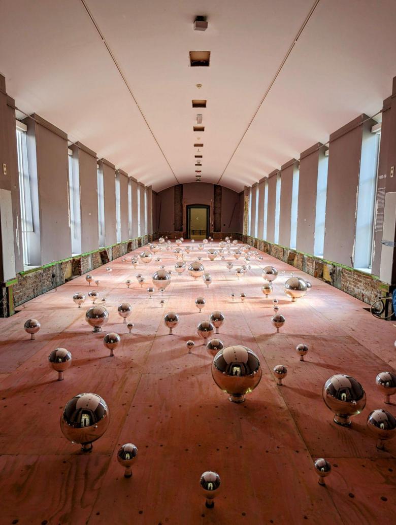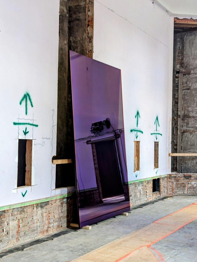 The traces of ornate staircases, barriers guarding holes in walls, a purple mirror resting against a broken brick wall, green industrial arrow marks juxtaposed with vibrant mural lettering, sculptures of iguanas and exposed HVAC ducts running in tandem, and a nine-meter whirling installation redefining a staircase core — all ignite a dialogue uniting disparate elements in a symphony of contrasts. Through a diverse toolkit of techniques and creative choices, the exhibition accentuates the omnipresent complexity between the consciously curated artworks and the accidental construction remains. Above all, these diligent interventions, such as Adrianus Kundert's Labyrinth activating the courtyard and Maria Roosen's glass orbs reflecting the vaulted room, enhance the museum’s grandeur, poetically emphasizing the elements and spaces of the past and the future.