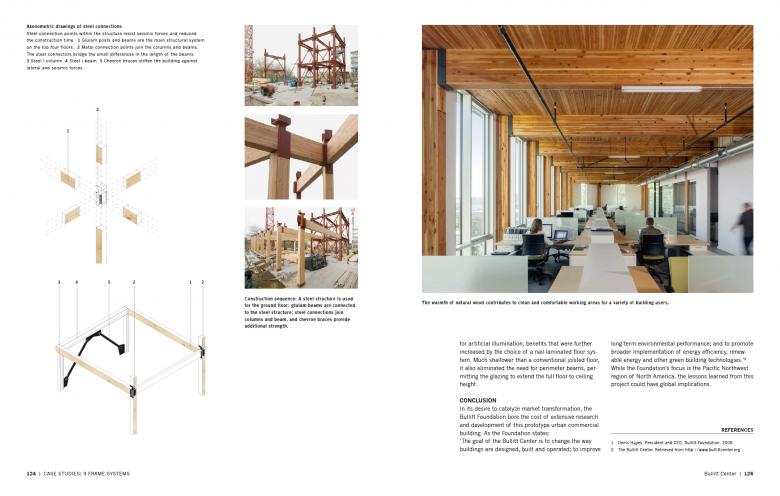The inspiring case studies of the third section, which make up the bulk of the book, are organized accordingly. Apartment buildings, office towers and academic facilities in Europe, North America and Oceania are discussed with relevance to program, climate and siting. The Bullitt Center in Seattle by Miller & Hull, for instance, is a post-and-beam frame made from glue-laminated timber that is filled with nail-laminated wood-panel floors. Its floating roof canopy used both for shading and solar power gives a bold expression to a new wooden architecture. The authors use intuitive detail drawings to explain the assembly of the different elements. Captivating photos illustrate the spatial qualities of the building's exterior and interior. And an exciting description of the construction sequence grasps the joyful process of its making.