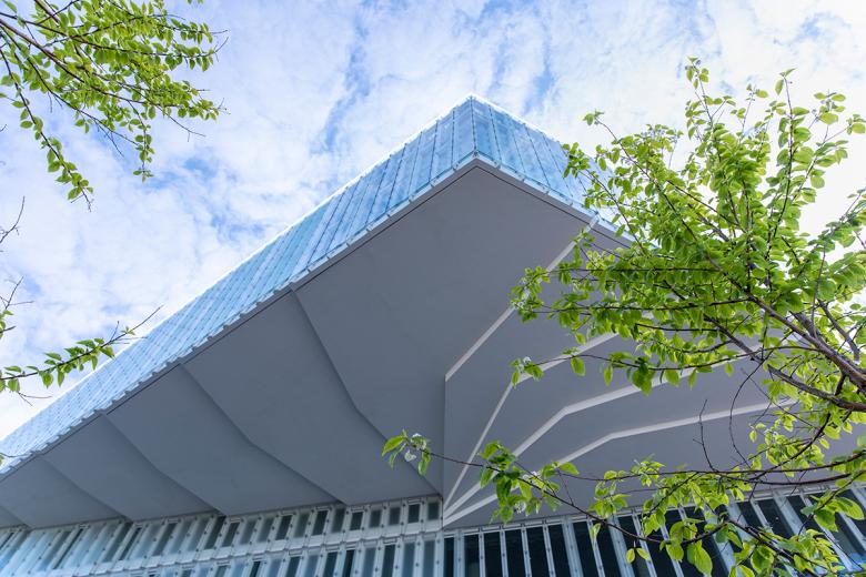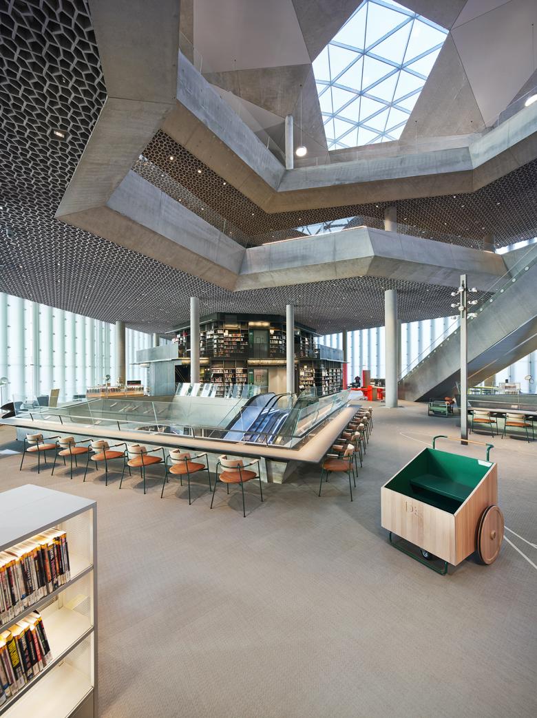 The facades of the library are a combination of transparent windows and translucent white glass walls, making the building looks blank and nondescript at first glance. The diffuse sunlight through the latter gives the interiors a calm, contemplative atmosphere, but only in the evening does the lighting give an insight into the rooms and activities inside the library. The spatial richness is all the greater and more pleasant inside, where three light wells run diagonally through the house of books and form a large atrium at their intersection. From each entrance, visitors encounter one of these diagonal voids as continuous spaces stretching up through the floors to the origami-like folded ceiling.
