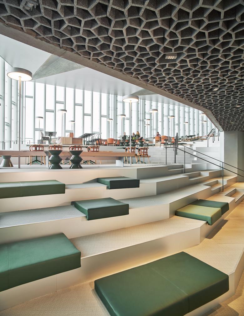 There is a long and wide staircase area between the 4th and the 5th floor called "The Forest," which can be used for small lectures. (Photo: Gatis Rozenfelds / AS Scenario Interiørarkitekter)