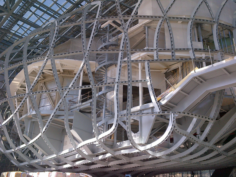 The convention center's glass box is made up of a double-skinned, steel-glass construction with a glass wall that frames a view of the Cloud when seen from the main axis. A sloping plaza leads to the entrance and a lower level where some of the exhibition spaces are located. Escalators lead up to a raised floor – a universal space that is column-free and completely open, minus the Cloud suspended overhead. Developed with structural engineer Massimo Majowiecki, the apparently weightless (only touching the floor in one spot) construction is 129 meters long, 65 meters wide, and 29 meters tall. Stairs, escalators and bridges provide access to the Cloud's interior, where an auditorium for 1,600 people, various meeting rooms, foyers, and a cafe are found.