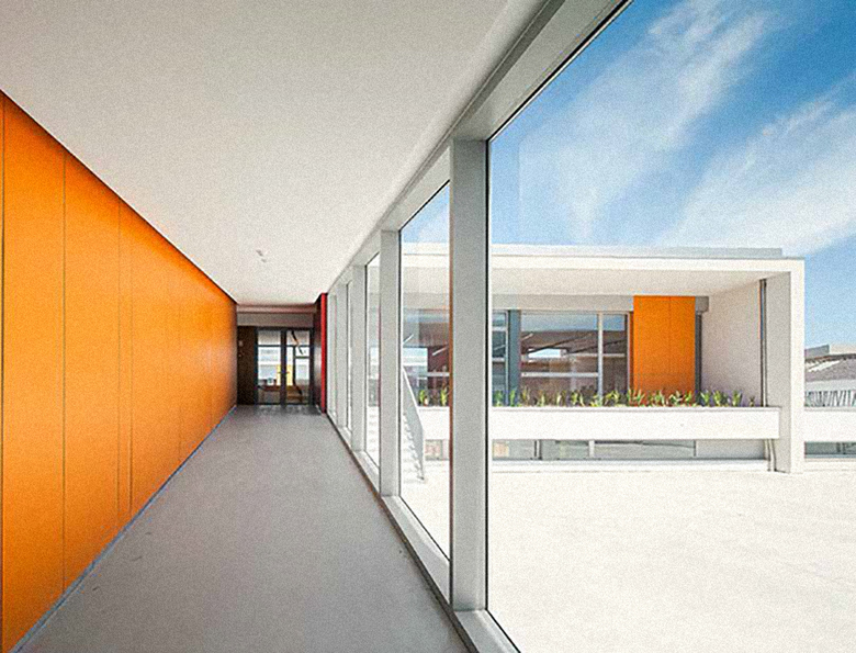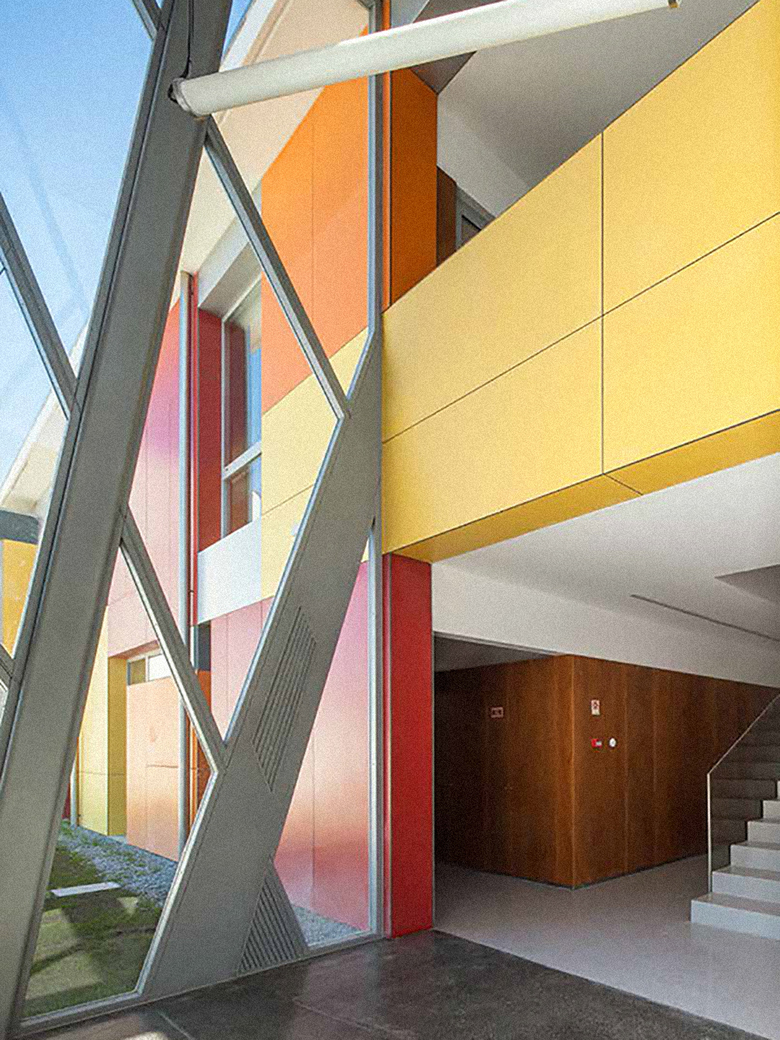 In a Swisspearl interview with Fernandes, the architect describes the Custoias neighborhood of Matosinhos as "not one of the most beautiful parts of the city." So he took it upon himself to try to make a difference, "to create a new identity through our school building," and "express the activities of the children within." Color is an integral part of this expression, often with a direct correlation to the classroom space behind it. In other words, the windows and solid panels of color are derived from the particular needs of the classrooms. The windows in day care rooms, for example, extend to the floor, so crawling babies can look outside. This approach creates the interlocking jigsaw façades of glass and color.