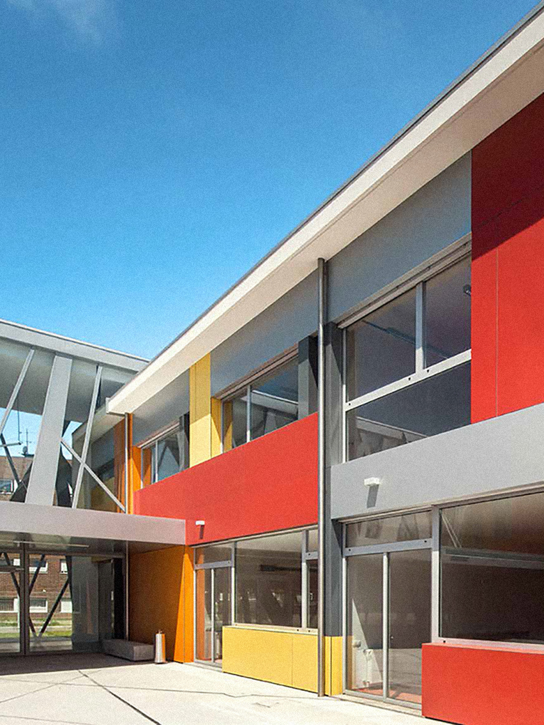 Yellow, orange and red panels of different sizes are applied in a neo-Corbusian manner to activate the circulation and play areas in an addition to a school designed by the architect's father in the early 1970s.