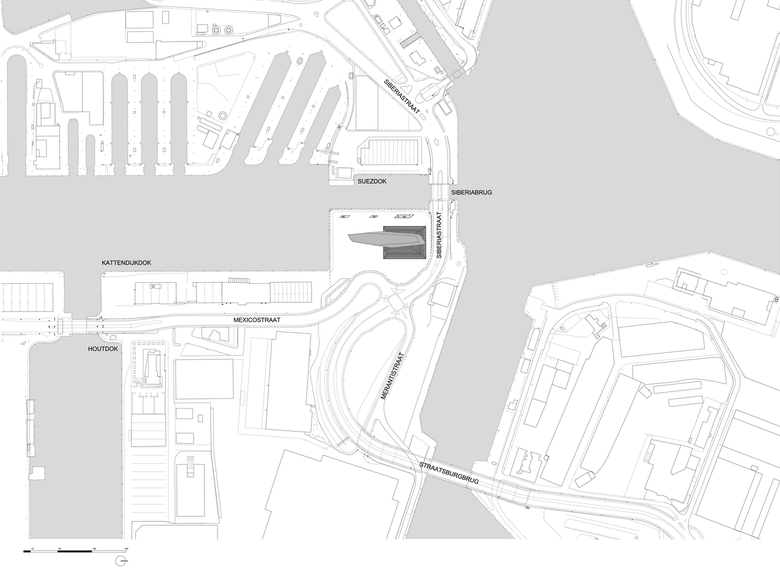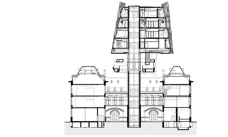 ZHA's design is based on three principles that were the result of historical research and analysis of the site and building carried out with Origin, restoration consultants from Brussels: Each of the existing building's four façades is equally important given its siting and their treatment; the location has a clear north-south axis parallel to the Kattendijkdok peninsula; and their research unveiled the design of a tower planned for the fire station but never built. From these, ZHA lifted the addition so each existing facade is visible; they pointed the extension, like the bow of a ship, toward the Scheldt on the south; and they considered the vertical addition the completion of the fire station's intended but unrealized verticality.