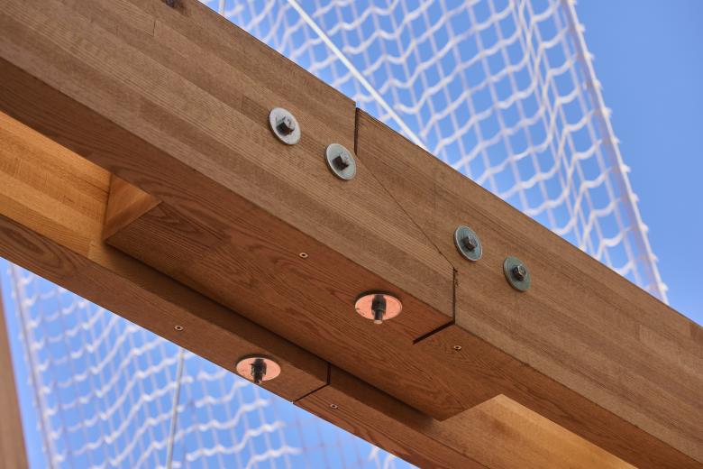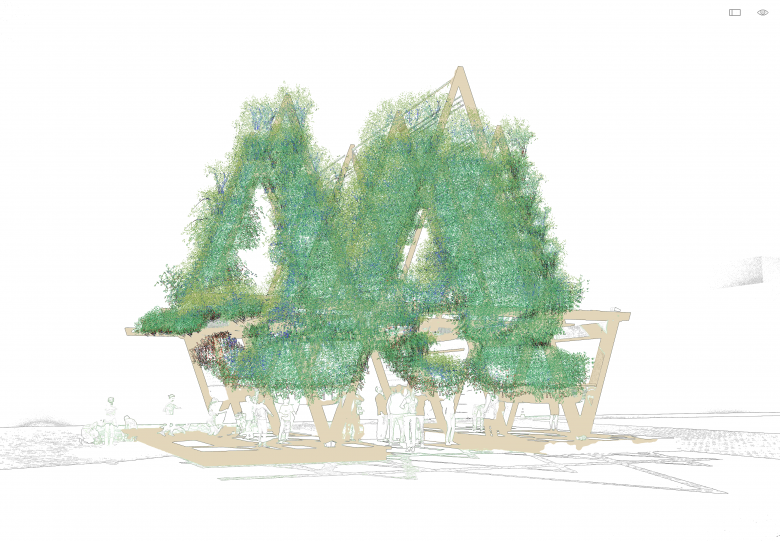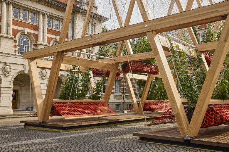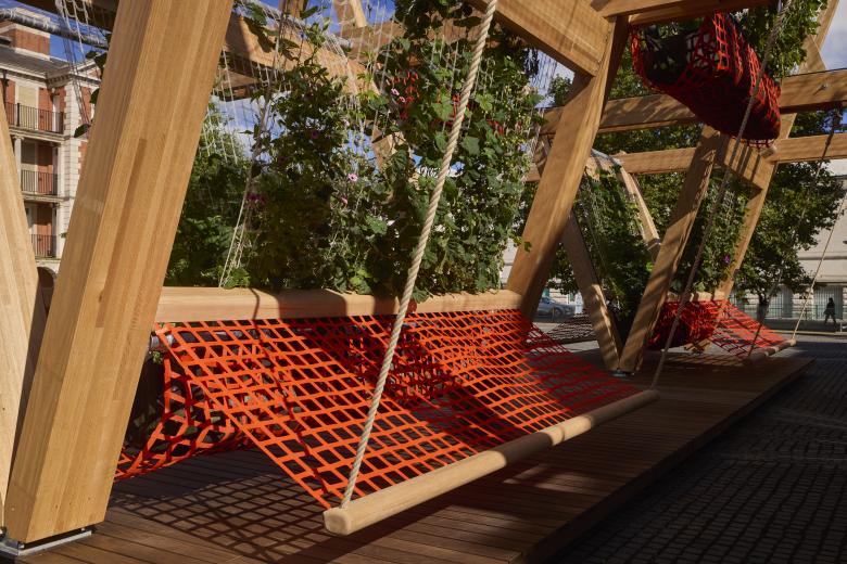 Made from red oak glulam (glue-laminated timber), Vert consists of triangular structures suspending biodegradable nets that are the framework for climbing plants rooted in textile planters. Also suspended are mesh benches positioned in the shade of the “sails” greened by around twenty species of plants. In addition to providing a cooling space for festival visitors, the installation purports to be “a living ecosystem that enriches local biodiversity [and] serves as a habitat for essential insect populations.” A statement from AHEC further describes that, “in an era of acute climate change, climbing plants can be more effective [at reducing carbon] as they grow many times faster [that trees], require less root space, and can be ‘harvested’ annually to be turned into biochar or recycled as raw material for the generation of energy.”