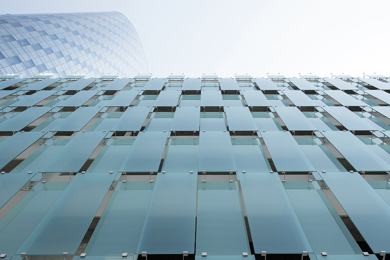 The parking structure's five levels are covered in two types of glass: white laminated glass in staggered panels facing Madison on the north and a matching elevation on the south; and fritted glass with a custom pattern in a flush layout facing Halsted on the west. The three elevations of the open-ventilated parking garage (the preferred approach in Chicago over costlier mechanically ventilated garages) use Bendheim's Wall-PF1 system. Per Bendheim, the patent-pending system uses "smartly engineered, field-adjustable mechanical fittings to install monumental decorative glass skins."