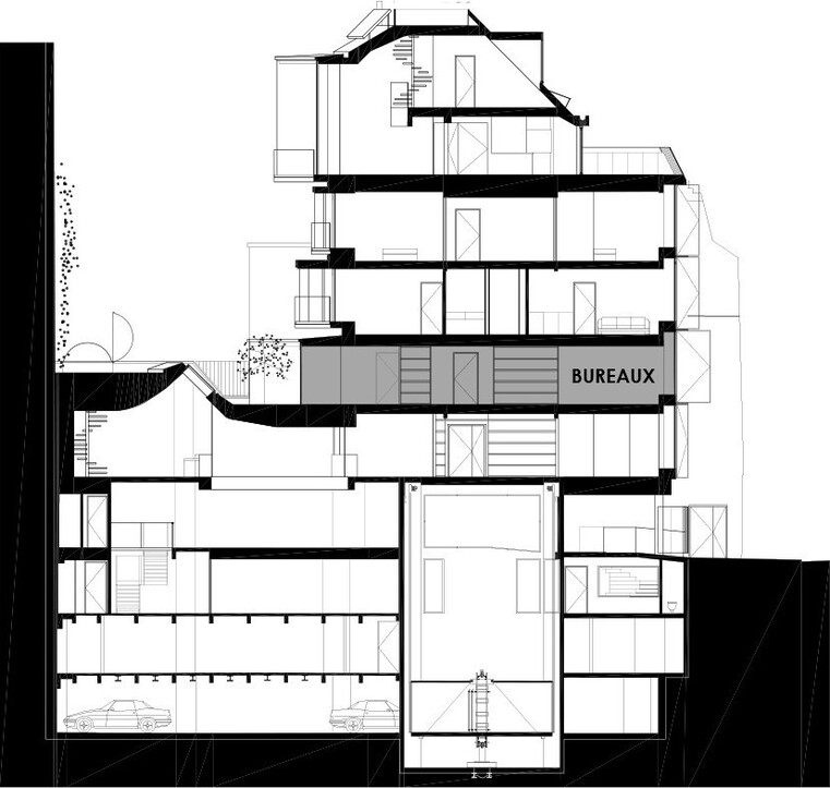 The three functions are stacked across the buildings ten floors, with the bottom three below grade and the top two set back from the front facade. (Drawing: Moussafir Architectes)