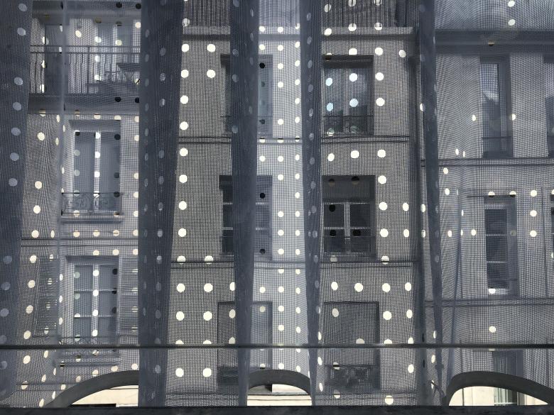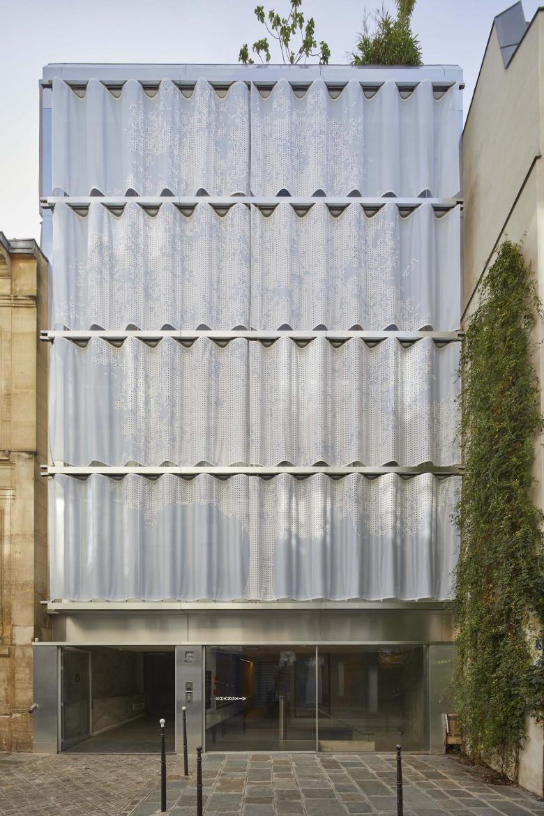 Paris's Moussafir Architectes worked with Inside Outside, the Amsterdam studio of Petra Blaisse, to develop a curtain that reduces glare, maintains privacy, and cools the building's interiors. The four stories of curtains are mounted to tracks built into the metal horizontals that cantilever from the suspended facade. The curtains open and close via a motorized system with built-in sensors.