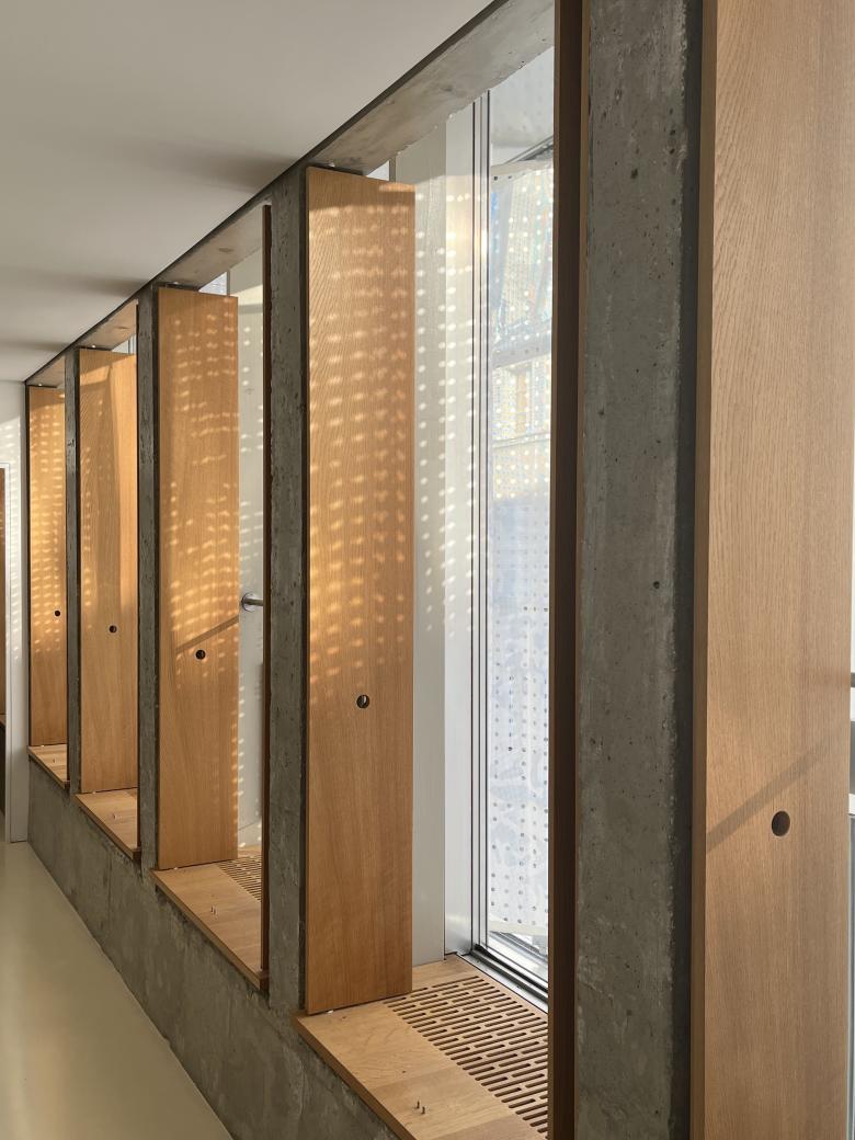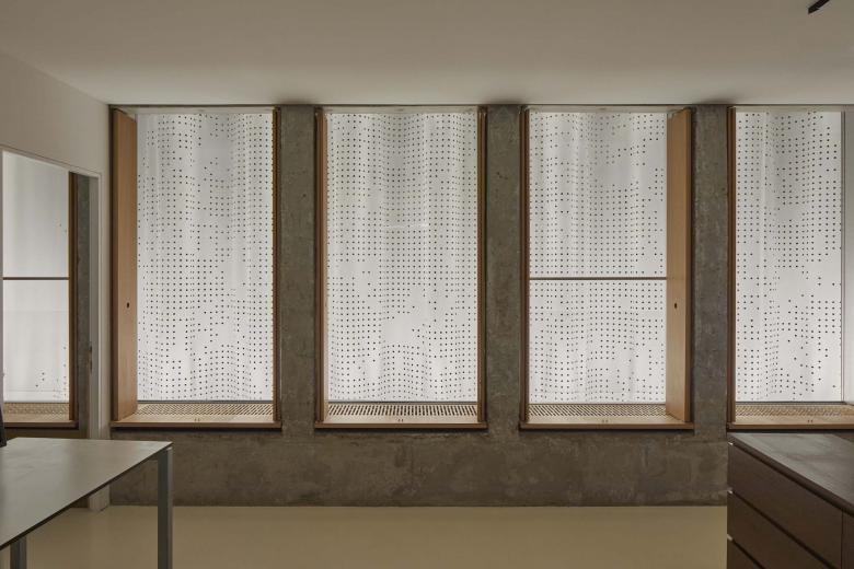 The existing building had windows set into the concrete exterior walls, but to comply with thermal regulations those windows were removed and new insulated glazing was built in front of the concrete, “exposing the materiality of the structure’s brutalist aesthetic,” in the architect's words. (The old openings are hard to grasp from the outside, but interior views showing the wooden shutters inserted into them are at bottom.)