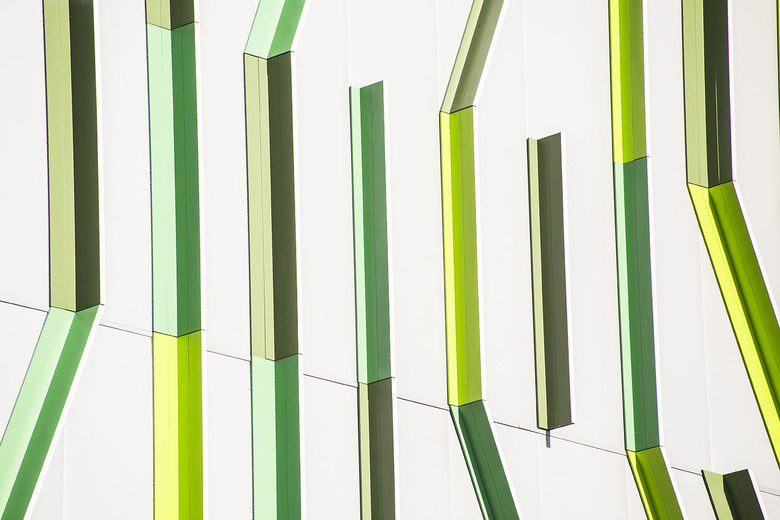 The vertical and angled blades were detailed as L-shaped extrusions, with the shades of green painted on the inside faces. This means that the greens are more pronounced when seen obliquely, but also that the greens do not disppear when the facades are seen head-on (as in the photos at top and bottom).