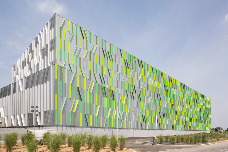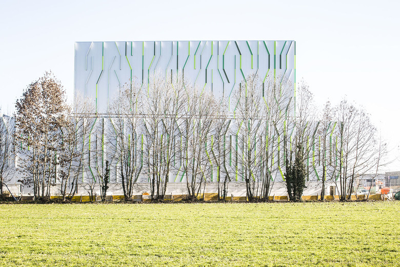Italian architect Cino Zucchi has covered the new automated warehouse for furniture company Pedrali with aluminum fins in three shades of green in reference to the countryside that surrounds the building.