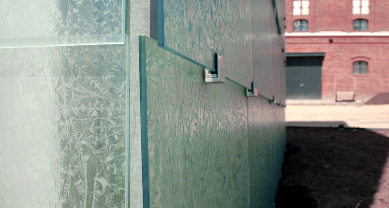 The site's most dramatic additions are glass cubes of different sizes that are arranged as needed, bringing natural light to the gallery spaces below. Admitting light during the day and glowing at night, the glass surfaces have an ornamental surface that is reminscent of ice crystals. The technology behind this is not new – a procedure for processing glass with this result was patented in 1883 – but it has been combined with new technologies for controlled production. In it, the surface is roughened by sandblasting and then swept by "Knochleim," a solution of water and gelatin. When it dries, the loss of moisture leads to shrinkage and stresses in the glass. Finally, the glass breaks at the surface, producing glass shells with frost-like patterns. At the Silesian Museum the pattern has a fine filigree appearance, but Glas Marte's ICE-H® process is so highly controlled that other effects – thick/thin, large/small, light/dark – are possible.