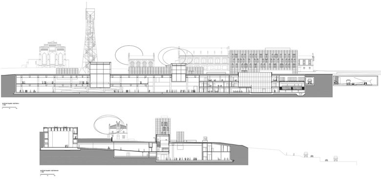 Thus, Riegler Riewe Architekten from Graz designed the museum with the idea of ​​intervening as minimally as possible on the industrial infrastructure while still providing a generously sized, functional museum. The logical consequence of this approach was to arrange almost all of the spaces underground, a tribute to the terrain's former function as a mine. A public recreation area with a newly created network of paths, squares, and parks was created. Furhter, the mine's headframe was also made accessible through a mounted lift, so visitors can ascend it for panoramic views of Katowice and the surrounding region.