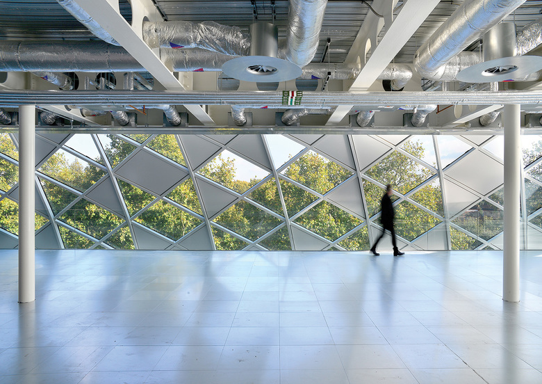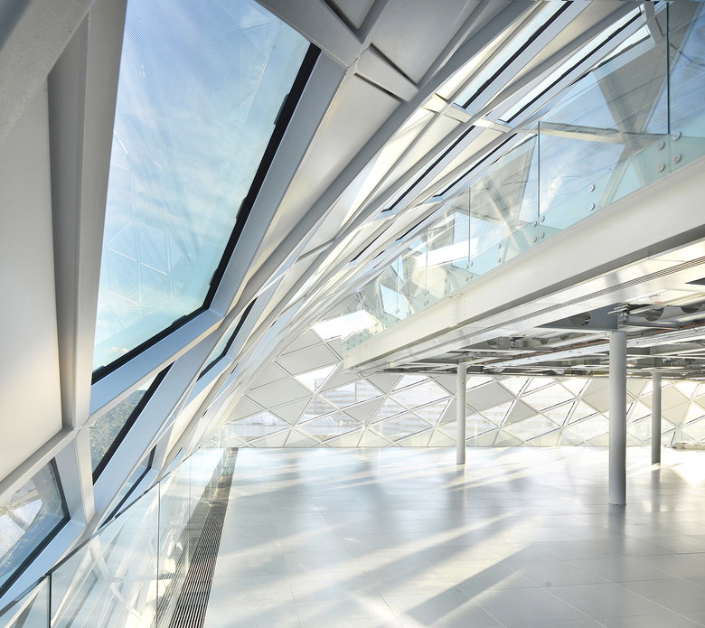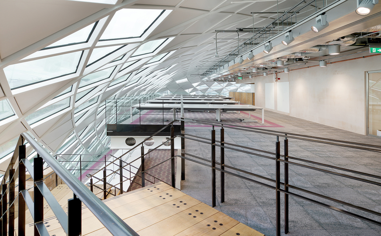 With its heritage listing, the 83,000-square-foot building had to maintain its front façade, the former ground floor showroom at the northeast corner, and other important architectural elements. ColladoCollins Architects was responsible for the refurbishment of the existing building and the design of the addition. They designed the 50,000-square-foot addition as a glass vault (60 meters long, 30 meters wide, 14 meters tall) that complements the existing three-story brick building. In form and material the dome actually recalls nineteenth-century glass palaces. Although it appears historical, the WAF-shortlisted project (office category) uses contemporary technologies: a diagrid structure and insulating glass units made from laminated safety glass with solar-control coating. Further, the apparently random pattern of transparent and opaque panels (based on precise physics calculations for solar control) has a contemporary feel on the interior that belies the exterior expression.
