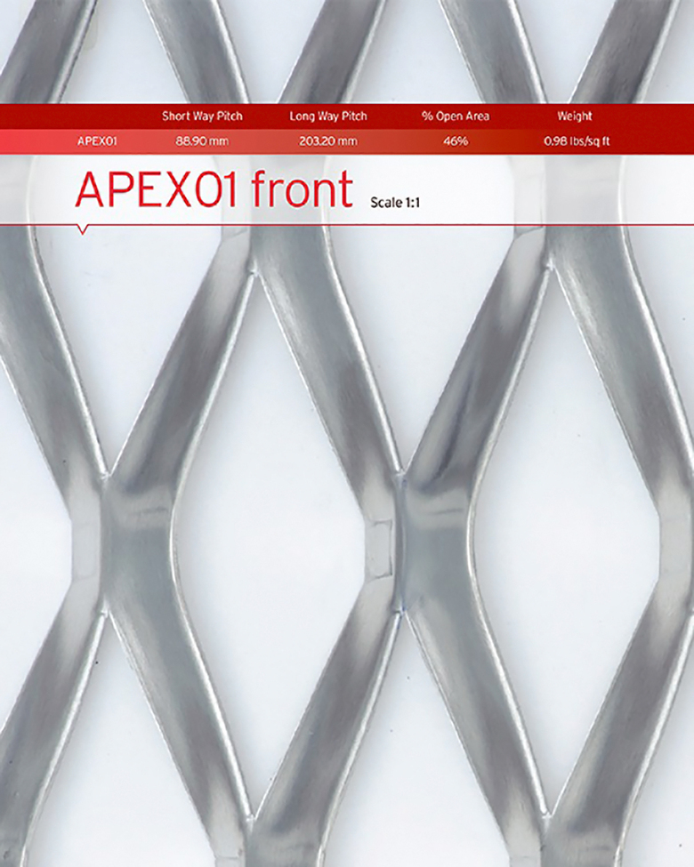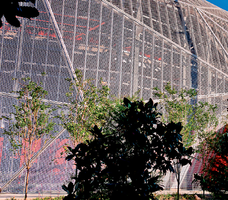 Extruded mesh is created by slitting and stretching rolled sheets of aluminum, yielding coverage of four times the raw material—therefore the 4x9-foot sheets covering the stadium were initially 1x2-1/4-feet (0.3x0.7-meters). Combined with the fact the sheets gain strength through the 3-dimensional stretching (note the raised profiles below), the mesh is efficient and much less wasteful than perforated sheets, whose holes become waste.