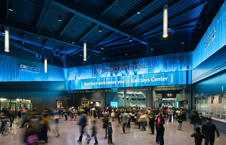 Brooklyn's Barclays Center—home to the Nets basketball team as well as a venue for music and other events—presents a face to the neighborhood of predominantly one material: rusted steel. But against the urban grit can be found LED screens that extend inside where they are accompanied by metal coils—Cascade Coil's bronze "architectural drapery"—to give the project some sheen.