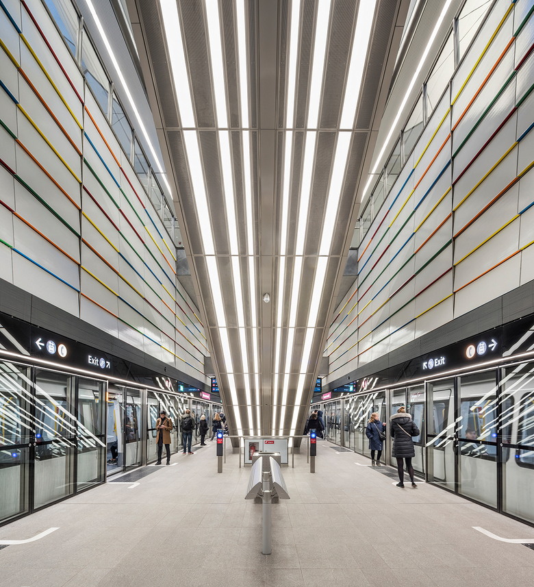 On September 29, 2019, Copenhagen's Cityringen (City Circle Line) metro opened to the public. Color is used to aid in wayfinding and to create a distinct identity for each of its seventeen stations. The entrances and platforms of some of the stations are lined in ceramic panels made by MOEDING.
