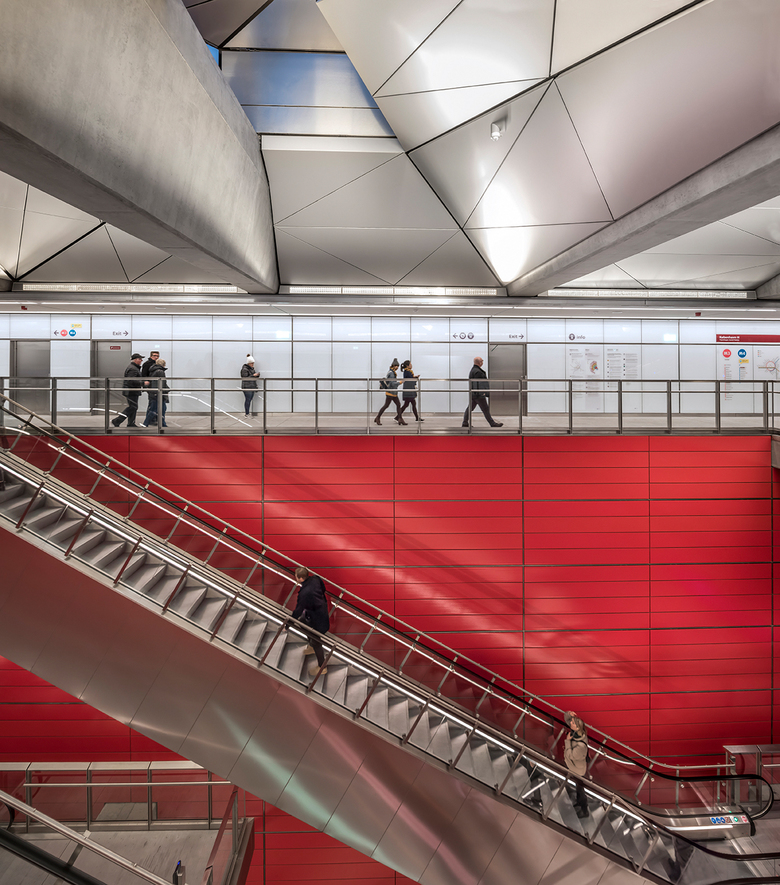 Traversing sixteen kilometers, the Cityringen touches a variety of places across Copenhagen, leading to a "user-centric design" inspired by the context of each station. According to Arup, which led the architectural design, they were inspired by Scandinavian design and and therefore created "spacious, light-filled stations with distinctive internal façades that echo the local spirit of the areas they connect to." A few examples are highlighted here, each of them using color underground to relate to conditions above ground. Red stations, as dictated by the Danish State Railways, indicate a transfer is available to another line.