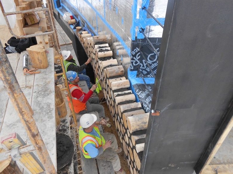 Think "masonry" and most likely brick or concrete block (CMU) comes to mind. But by definition, masonry – the joining of individual units together by mortar – does not preclude other materials, such as stone, glass block or even logs. Cordwood masonry construction is built from cut logs that are laid perpendicular to the face of the wall. Together with the mortar, the logs create monolithic walls or facades, just like brick or CMU but with a much different appearance due to the round sections of the timber and the greater amount of mortar used (40 percent in cordwood walls versus 20 percent in brick walls, per Architectural Record).